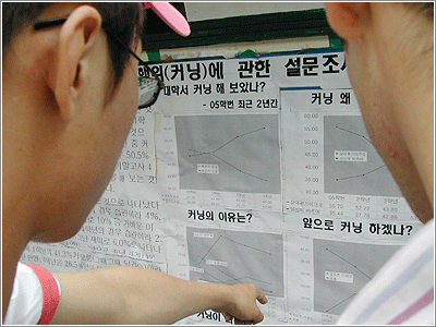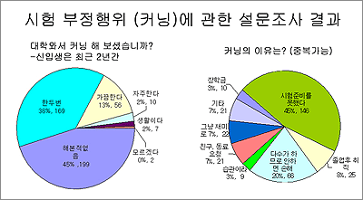 대학생이라면 한번쯤 경험해 봤을 법한 상황. 하지만 얼마나 많은 학생들이 커닝을 하는지에 대해선 막연하게만 알고 있는 상황이다. 그러던 중 본교의 커닝실태에 관한 설문조사 결과가 나와 ‘심증’을 확인시켰다. 바로 동아리연합회 종교분과에서 커닝에 관한 설문조사가 실시한 것. 지난 4월 13일과 14일, 양일 동안 4개의 대단위 교양강의(대학생과 청년문화, 인간과 윤리적 삶, 기독교와 현대사회, 불멸의 철학자들) 수강생 4백43명을 설문조사한 결과 안전지대가 아님이 확인됐다. 동아리연합회 종교분과장을 맡고 있는 곽제하(경금대·경제금융 3) 군은 이번 설문조사에 대해 “조사 결과 과반수가 넘는 학생들이 커닝을 해봤다고 답함으로써 고등학교 때보다 커닝 문화가 심각한 것으로 나타났다”며 ‘커닝문화’의 현주소를 말했다.