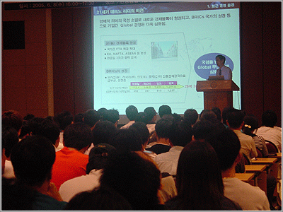 노기호 대표이사는 72년 본교 화학공학과를 졸업하고 대학원에 진학하여 공부하던 중 LG에 입사해 대표적 공과대 출신 CEO로 자리매김했다. HIT 6층 대회의실에서 진행된 노 대표의 강연은 이공계 출신 CEO의 역할과 전망에 관한 주제로 한 시간 반 가량 계속됐다. 노 대표는 “21세기가 원하는 인재상은 경영지식과 기술적 지식을 겸비한 테크노 CEO(CTO)다. 우리나라의 성장 동력을 이끌어가기 위해 공학도의 역할이 중요하다. 바로 여러분의 앞날은 열려있는 것이다”라고 말해 경영학적 지식을 갖춘 공학도에게는 많은 기회와 가능성이 있음을 시사했다. 그는 또한 “세계적인 기업 닛산, 마이크로소프트, 인텔, 야후, BMW 등의 CEO도 모두 이공계 출신이고 국내 기업의 공학도 출신 CEO 중엔 한양대 출신이 가장 많다”며 학생들에게 자부심을 가질 것을 당부했다.