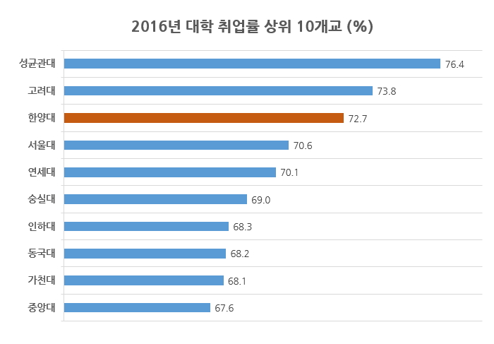 종로학원하늘교육이 1월 19일 정부 교육통계서비스를 활용해 전국 194개 대학의 2016년 졸업자(2015년 8월ㆍ2016년 2월 졸업) 취업률을 분석한 결과, 한양대는 전년(68.7%)보다 4%포인트 오른 72.7%를 기록해 졸업생 수가 3000명 이상인 대형 대학 42곳 가운데 3위를 기록했다. 1위는 성균관대(76.4%)가 차지했다. 이어 고려대(73.8%), 한양대(72.7%), 서울대(70.6%), 연세대(70.1%), 숭실대(69.0%), 인하대(68.3%), 동국대(68.2%), 가천대(68.1%), 중앙대(67.6%)가 취업률 상위 10위 안에 이름을 올렸다.