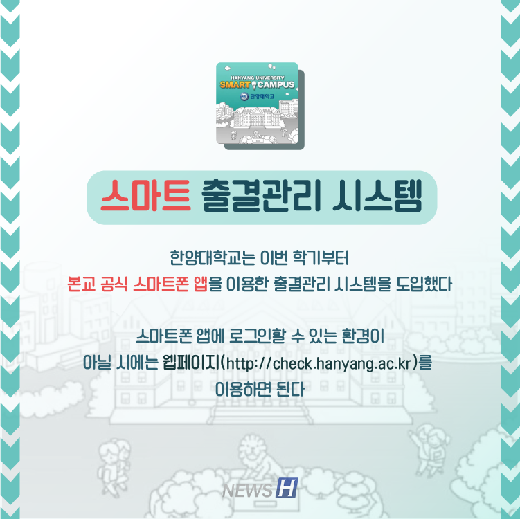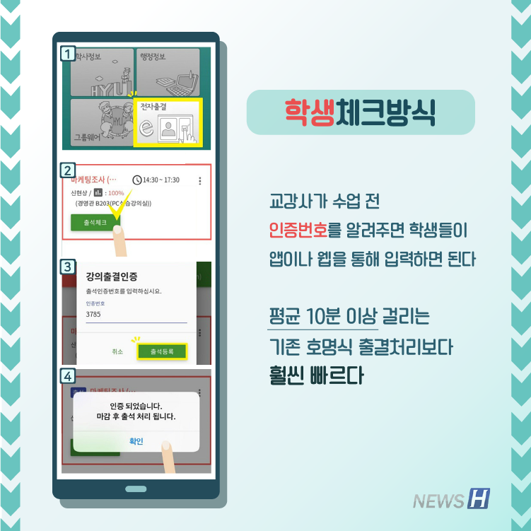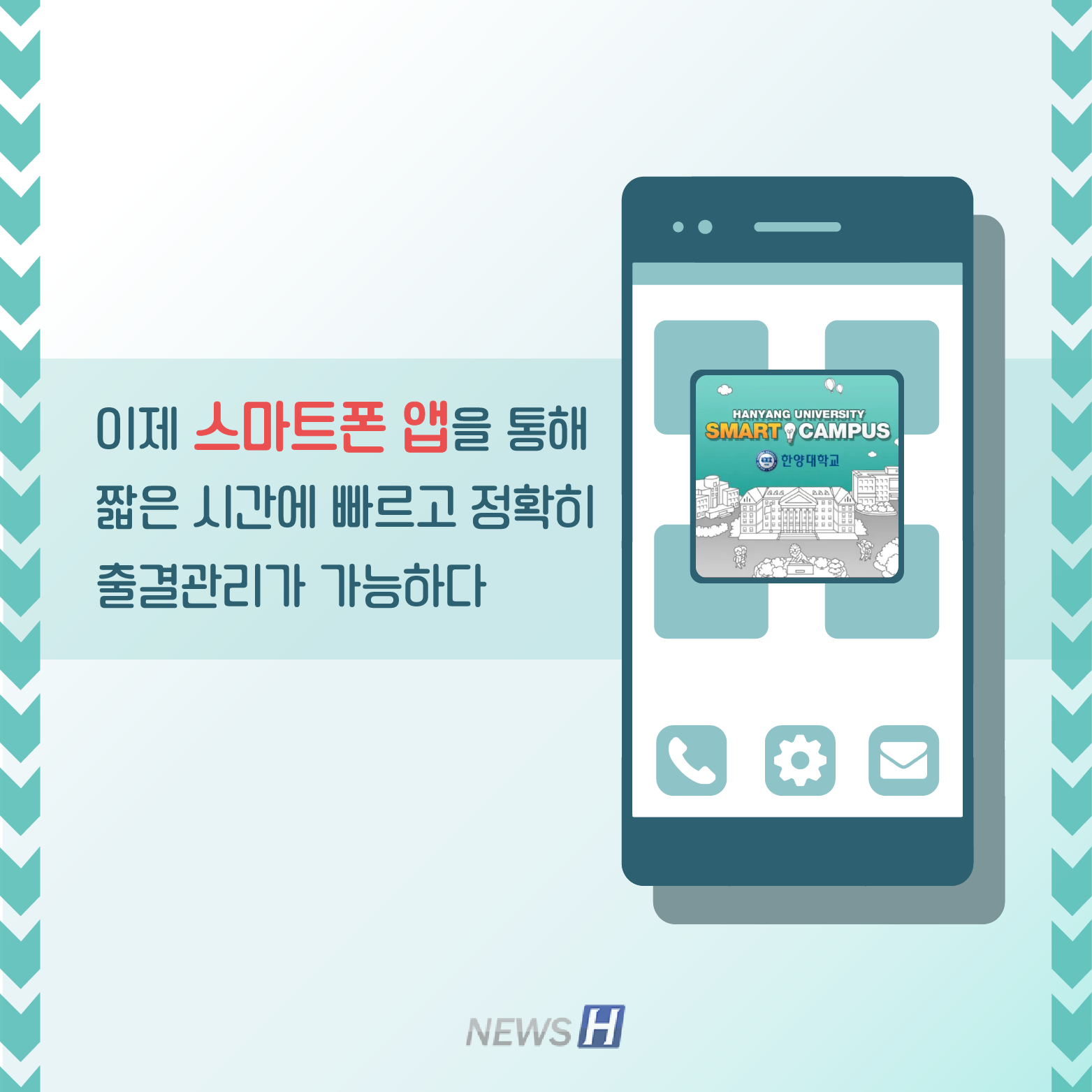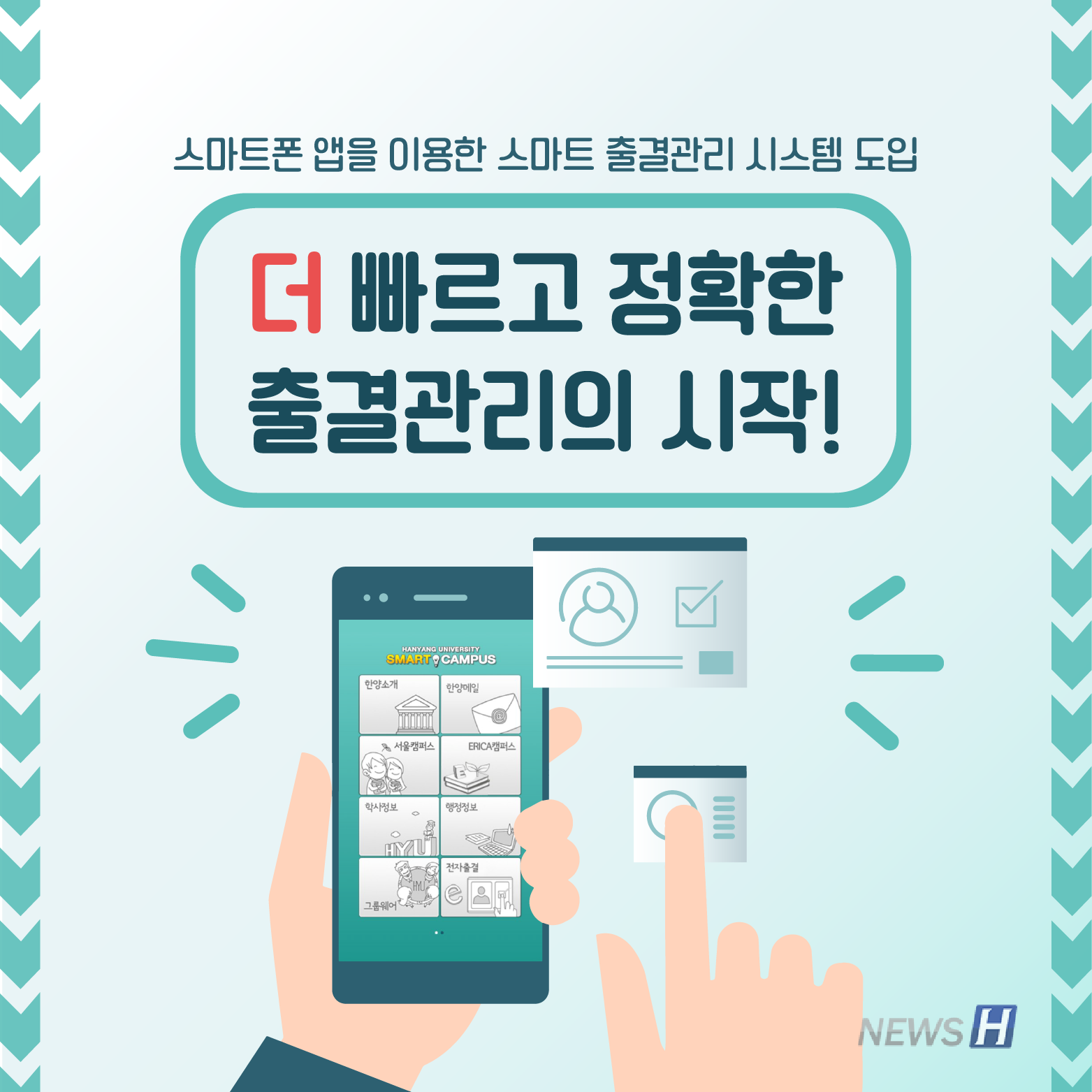 스마트폰 앱을 이용한 스마트 출결관리 시스템 도입 ▲ 카드뉴스의 원본 기사는 아래에서 읽을 수 있습니다더 빠르고 정확한 출결관리의 시작 김지민 spotlight_5@naver.com 다른기사 보기 저작권자 © 뉴스H 무단전재 및 재배포 금지 당신만 안 본 뉴스 [포토스토리] "AI 시대 해답은 브랜딩", 오세훈 서울시장의 경영학 특강 현장 Into the Creation 2025, 창작자들의 꿈에 날개를 이찬규 학생, 사이버·우주 융합연구로 2025 사이버안보논문공모전 대상 수상 한양대, '2026 QS 지속가능성 순위' 세계 161위, 국내 4위 기록 해커톤에서 인턴십까지, 현대차 사내 스타트업에 다녀오다 [창업지원단 인턴십 경험기] [포토스토리] 한양 속에 사회혁신을 품다, SSIR 먼슬리 콜로키움 현장 행복은 좋은 경험의 ‘빈도’에서, 서은국 교수와 함께한 한양인의 힐링콘서트 현장 2025 중앙일보 대학평가 서울 3위, ERICA 13위 댓글삭제 삭제한 댓글은 다시 복구할 수 없습니다. 그래도 삭제하시겠습니까? 비밀번호 닫기 기사 댓글 0 댓글 접기 로그인 후 이용 가능합니다. 댓글 내용입력 비회원 로그인 이름 비밀번호 댓글 내용입력 댓글쓰기 계정을 선택하시면 로그인·계정인증을 통해 댓글을 남기실 수 있습니다. 회원 로그인 비회원 글쓰기 이름 비밀번호 자동등록방지 로그인 옵션 창닫기 기획기사 [포토스토리] "AI 시대 해답은 브랜딩", 오세훈 서울시장의 경영학 특강 현장 Into the Creation 2025, 창작자들의 꿈에 날개를 해커톤에서 인턴십까지, 현대차 사내 스타트업에 다녀오다 [창업지원단 인턴십 경험기] [포토스토리] 한양 속에 사회혁신을 품다, SSIR 먼슬리 콜로키움 현장 행복은 좋은 경험의 ‘빈도’에서, 서은국 교수와 함께한 한양인의 힐링콘서트 현장 [카드뉴스] '한양대학교 SDGs? 알고 보니 내 일상 속에 있었다!' 1편
