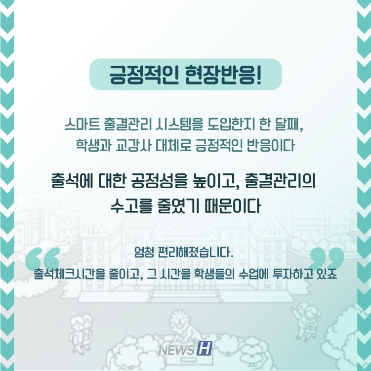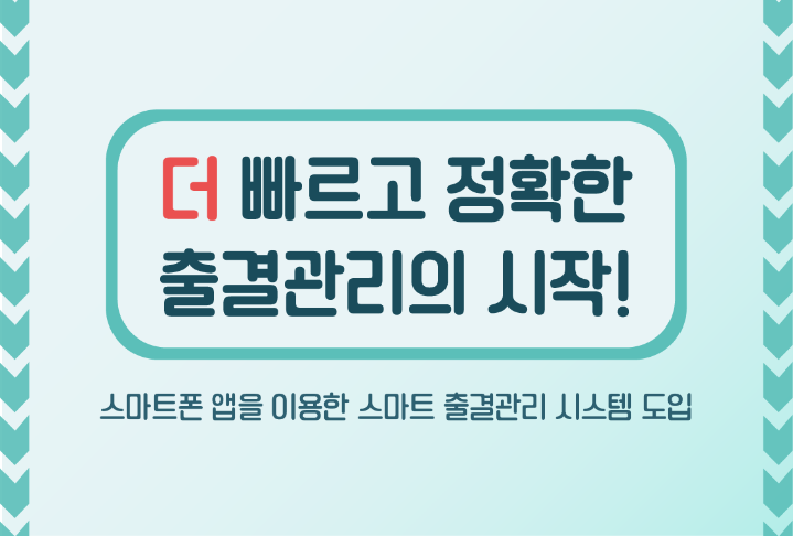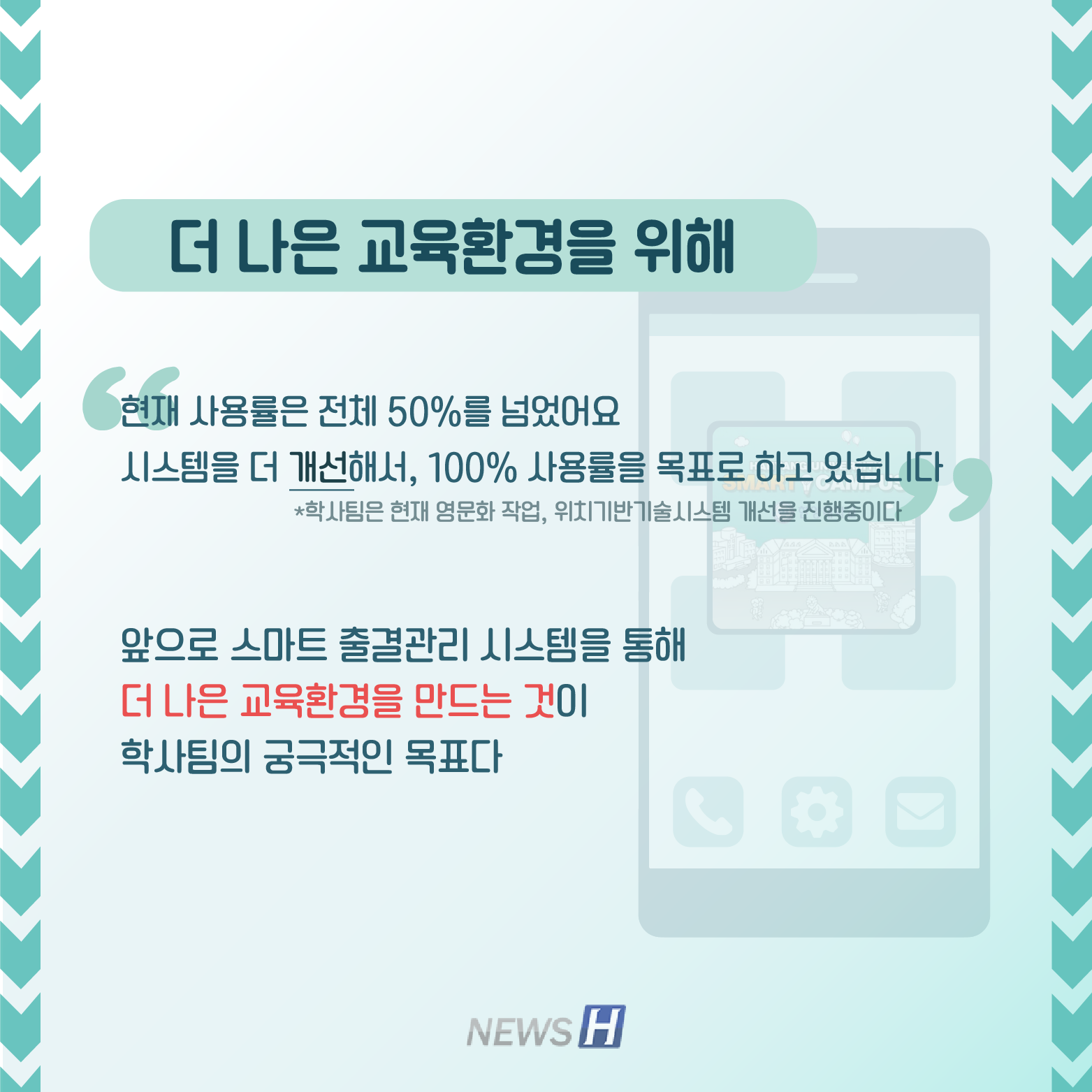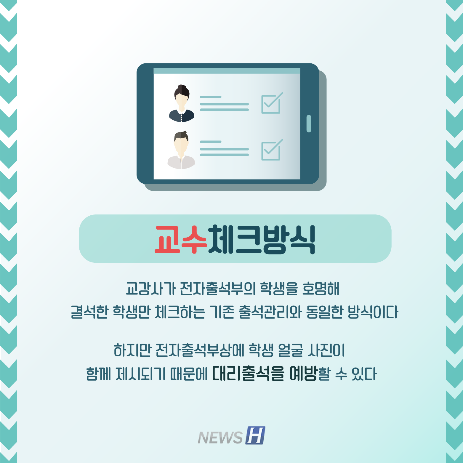 스마트폰 앱을 이용한 스마트 출결관리 시스템 도입 ▲ 카드뉴스의 원본 기사는 아래에서 읽을 수 있습니다더 빠르고 정확한 출결관리의 시작 김지민 spotlight_5@naver.com 다른기사 보기 저작권자 © 뉴스H 무단전재 및 재배포 금지 당신만 안 본 뉴스 [포토스토리] "AI 시대 해답은 브랜딩", 오세훈 서울시장의 경영학 특강 현장 Into the Creation 2025, 창작자들의 꿈에 날개를 이찬규 학생, 사이버·우주 융합연구로 2025 사이버안보논문공모전 대상 수상 한양대, '2026 QS 지속가능성 순위' 세계 161위, 국내 4위 기록 해커톤에서 인턴십까지, 현대차 사내 스타트업에 다녀오다 [창업지원단 인턴십 경험기] [포토스토리] 한양 속에 사회혁신을 품다, SSIR 먼슬리 콜로키움 현장 행복은 좋은 경험의 ‘빈도’에서, 서은국 교수와 함께한 한양인의 힐링콘서트 현장 2025 중앙일보 대학평가 서울 3위, ERICA 13위 댓글삭제 삭제한 댓글은 다시 복구할 수 없습니다. 그래도 삭제하시겠습니까? 비밀번호 닫기 기사 댓글 0 댓글 접기 로그인 후 이용 가능합니다. 댓글 내용입력 비회원 로그인 이름 비밀번호 댓글 내용입력 댓글쓰기 계정을 선택하시면 로그인·계정인증을 통해 댓글을 남기실 수 있습니다. 회원 로그인 비회원 글쓰기 이름 비밀번호 자동등록방지 로그인 옵션 창닫기 기획기사 [포토스토리] "AI 시대 해답은 브랜딩", 오세훈 서울시장의 경영학 특강 현장 Into the Creation 2025, 창작자들의 꿈에 날개를 해커톤에서 인턴십까지, 현대차 사내 스타트업에 다녀오다 [창업지원단 인턴십 경험기] [포토스토리] 한양 속에 사회혁신을 품다, SSIR 먼슬리 콜로키움 현장 행복은 좋은 경험의 ‘빈도’에서, 서은국 교수와 함께한 한양인의 힐링콘서트 현장 [카드뉴스] '한양대학교 SDGs? 알고 보니 내 일상 속에 있었다!' 1편