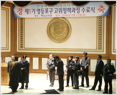 또한 김형수 영등포구청장은 “영등포구는 급변하는 사회의 속도에 발맞춰 국민의 평생교육실현을 위해 노력할 것이다”며 “교육환경을 개선하고 고위정책과정을 수료한 이 자리의 훌륭한 정책전문가들과 노력을 합심하여 선진 도시로 이끌어 나갈 것”이라고 이날의 학위 수료자들의 역할을 강조했다. 김 청장의 말처럼 지역 사회의 행정을 책임질 학사모 차림의 수많은 행정인들의 뒷모습은 누구보다도 듬직해보였다. 이들이 한양의 새로운 동문으로써, 또 지역 사회 행정의 전문가로써 자리매김하길 기대해본다.