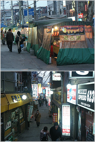 ‘오늘은 어디에서 밥을 먹을까’, ‘새롭고 맛있는 곳 없나’ 하고 고민하는 학생들. 음식점으로 향하는 분기점인 횡단보도 앞에서 고민하고 있을 때 눈에 띠는 것이 바로 한 줄로 늘어선 포장마차 행렬이다. 배고픈 이들은 이곳의 유혹을 결코 뿌리칠 수 없다. 떡볶이, 오뎅 튀김, 닭꼬치, 토스트 등 대표적 간식이 손님들을 기다린다. 가격은 모두 비슷하지만 주인 아저씨와 아주머니의 손맛은 제각각. 단골이 되면 조금 더 얹어 주시는 주인 아주머니의 인정이 넘친다. 한양인 뿐 아니라 근처 중, 고등학교에서도 이 곳 포장마차는 이미 유명했다.
