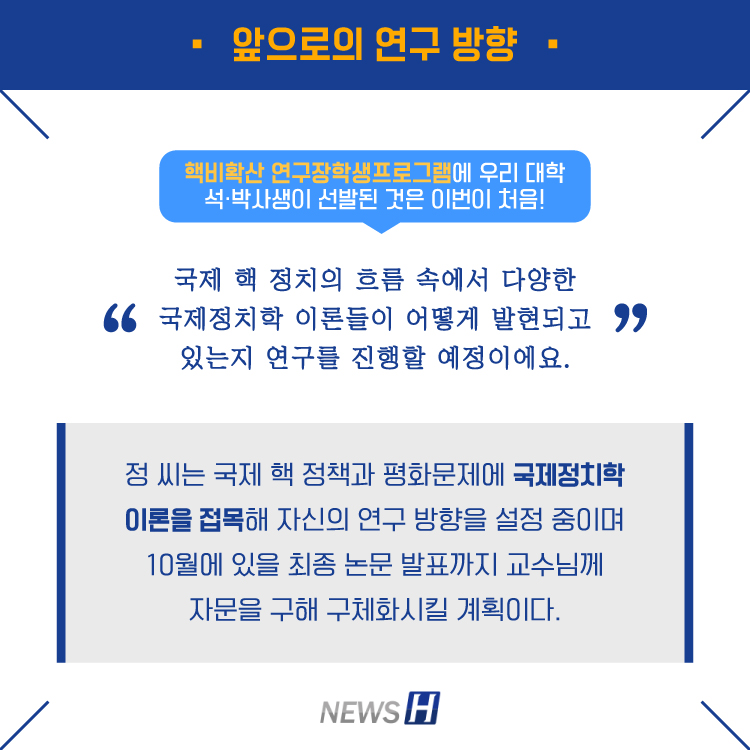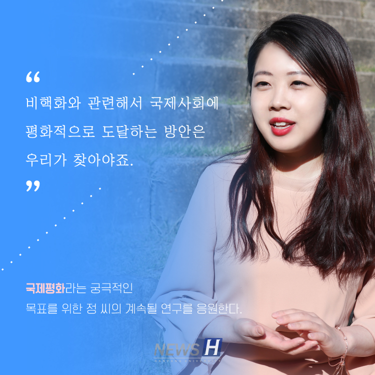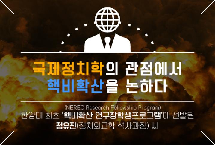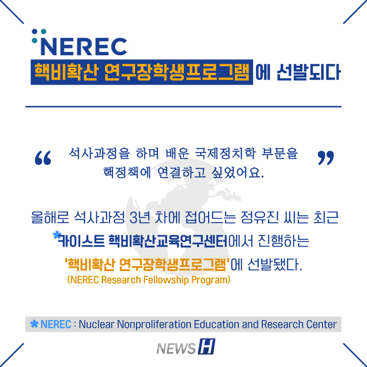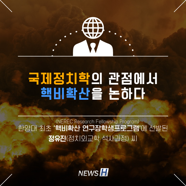 한양대 최초 ‘핵비확산 연구장학생프로그램’에 선발된 정유진(정치외교학 석사과정) 씨 ▲ 카드뉴스의 원본 기사는 아래에서 읽을 수 있습니다- 국제정치학의 관점에서 핵비확산을 논하다▲ Click to read the English article- A Lion in the Sky 전채령 dotteil@naver.com 다른기사 보기 저작권자 © 뉴스H 무단전재 및 재배포 금지 당신만 안 본 뉴스 [포토스토리] "AI 시대 해답은 브랜딩", 오세훈 서울시장의 경영학 특강 현장 Into the Creation 2025, 창작자들의 꿈에 날개를 이찬규 학생, 사이버·우주 융합연구로 2025 사이버안보논문공모전 대상 수상 한양대, '2026 QS 지속가능성 순위' 세계 161위, 국내 4위 기록 해커톤에서 인턴십까지, 현대차 사내 스타트업에 다녀오다 [창업지원단 인턴십 경험기] [포토스토리] 한양 속에 사회혁신을 품다, SSIR 먼슬리 콜로키움 현장 행복은 좋은 경험의 ‘빈도’에서, 서은국 교수와 함께한 한양인의 힐링콘서트 현장 2025 중앙일보 대학평가 서울 3위, ERICA 13위 댓글삭제 삭제한 댓글은 다시 복구할 수 없습니다. 그래도 삭제하시겠습니까? 비밀번호 닫기 기사 댓글 0 댓글 접기 로그인 후 이용 가능합니다. 댓글 내용입력 비회원 로그인 이름 비밀번호 댓글 내용입력 댓글쓰기 계정을 선택하시면 로그인·계정인증을 통해 댓글을 남기실 수 있습니다. 회원 로그인 비회원 글쓰기 이름 비밀번호 자동등록방지 로그인 옵션 창닫기 기획기사 [포토스토리] "AI 시대 해답은 브랜딩", 오세훈 서울시장의 경영학 특강 현장 Into the Creation 2025, 창작자들의 꿈에 날개를 해커톤에서 인턴십까지, 현대차 사내 스타트업에 다녀오다 [창업지원단 인턴십 경험기] [포토스토리] 한양 속에 사회혁신을 품다, SSIR 먼슬리 콜로키움 현장 행복은 좋은 경험의 ‘빈도’에서, 서은국 교수와 함께한 한양인의 힐링콘서트 현장 [카드뉴스] '한양대학교 SDGs? 알고 보니 내 일상 속에 있었다!' 1편