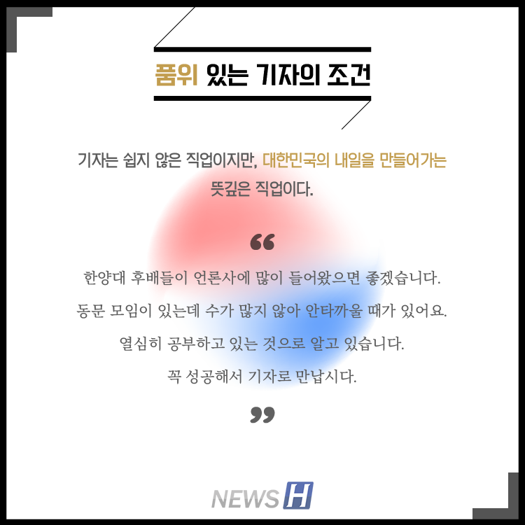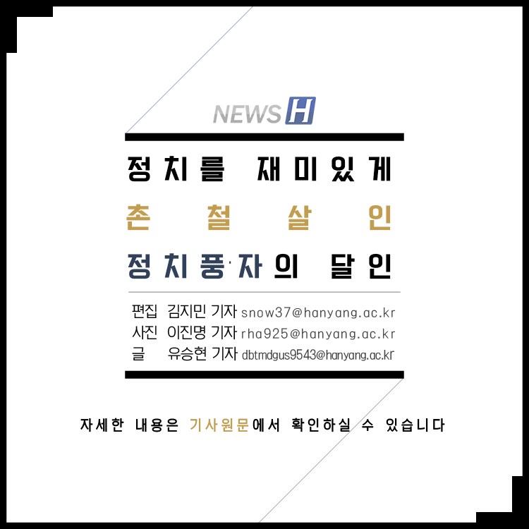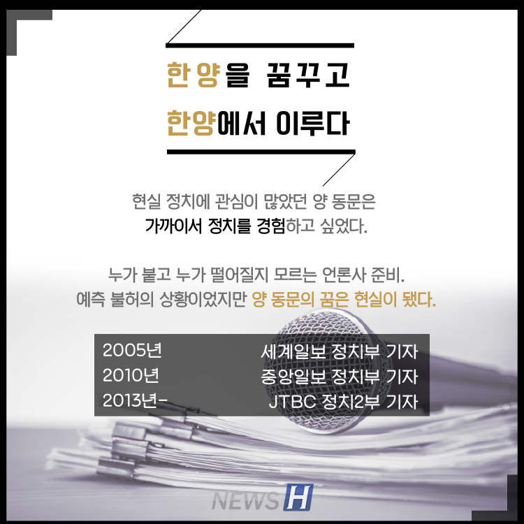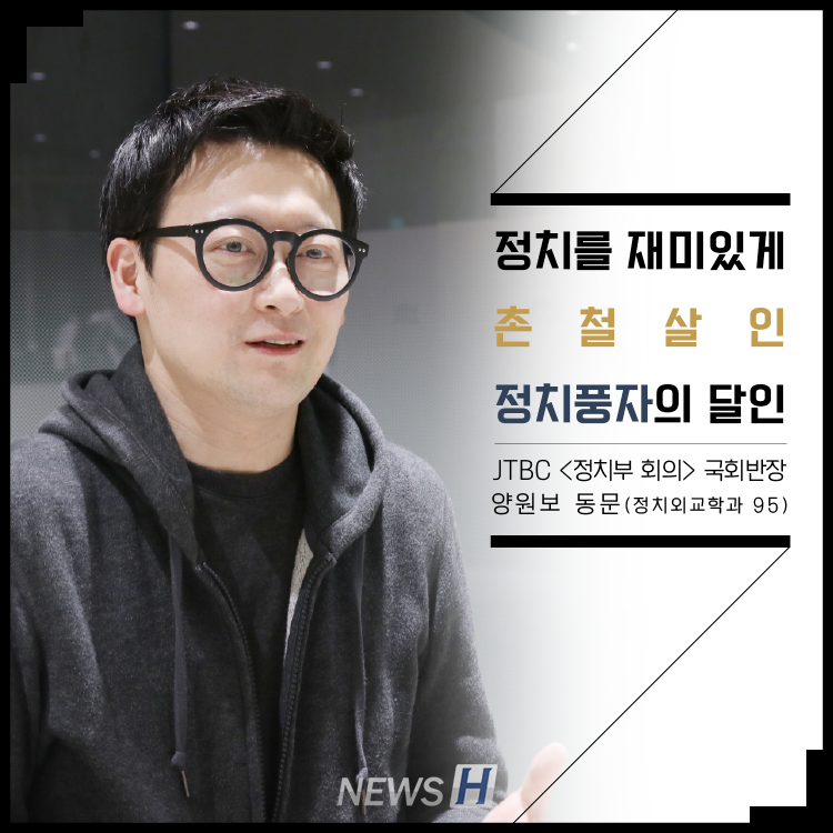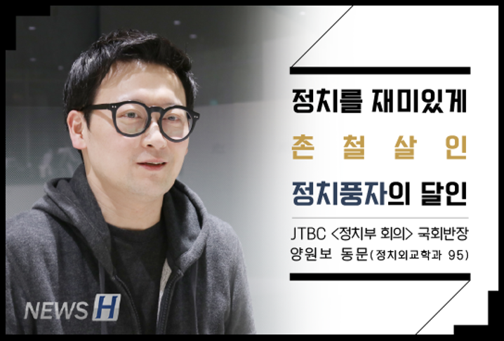 JTBC <정치부 회의> 국회반장 양원보 동문(정치외교학과 95) ▲ 카드뉴스의 원본 기사는 아래에서 읽을 수 있습니다- 정치를 재미있게, 촌철살인 정치풍자의 달인▲ Click to read the English article- JTBC Reporter Yang Won-bo 김지민 spotlight_5@naver.com 다른기사 보기 저작권자 © 뉴스H 무단전재 및 재배포 금지 당신만 안 본 뉴스 [포토스토리] "AI 시대 해답은 브랜딩", 오세훈 서울시장의 경영학 특강 현장 Into the Creation 2025, 창작자들의 꿈에 날개를 이찬규 학생, 사이버·우주 융합연구로 2025 사이버안보논문공모전 대상 수상 한양대, '2026 QS 지속가능성 순위' 세계 161위, 국내 4위 기록 해커톤에서 인턴십까지, 현대차 사내 스타트업에 다녀오다 [창업지원단 인턴십 경험기] [포토스토리] 한양 속에 사회혁신을 품다, SSIR 먼슬리 콜로키움 현장 행복은 좋은 경험의 ‘빈도’에서, 서은국 교수와 함께한 한양인의 힐링콘서트 현장 2025 중앙일보 대학평가 서울 3위, ERICA 13위 댓글삭제 삭제한 댓글은 다시 복구할 수 없습니다. 그래도 삭제하시겠습니까? 비밀번호 닫기 기사 댓글 0 댓글 접기 로그인 후 이용 가능합니다. 댓글 내용입력 비회원 로그인 이름 비밀번호 댓글 내용입력 댓글쓰기 계정을 선택하시면 로그인·계정인증을 통해 댓글을 남기실 수 있습니다. 회원 로그인 비회원 글쓰기 이름 비밀번호 자동등록방지 로그인 옵션 창닫기 기획기사 [포토스토리] "AI 시대 해답은 브랜딩", 오세훈 서울시장의 경영학 특강 현장 Into the Creation 2025, 창작자들의 꿈에 날개를 해커톤에서 인턴십까지, 현대차 사내 스타트업에 다녀오다 [창업지원단 인턴십 경험기] [포토스토리] 한양 속에 사회혁신을 품다, SSIR 먼슬리 콜로키움 현장 행복은 좋은 경험의 ‘빈도’에서, 서은국 교수와 함께한 한양인의 힐링콘서트 현장 [카드뉴스] '한양대학교 SDGs? 알고 보니 내 일상 속에 있었다!' 1편
