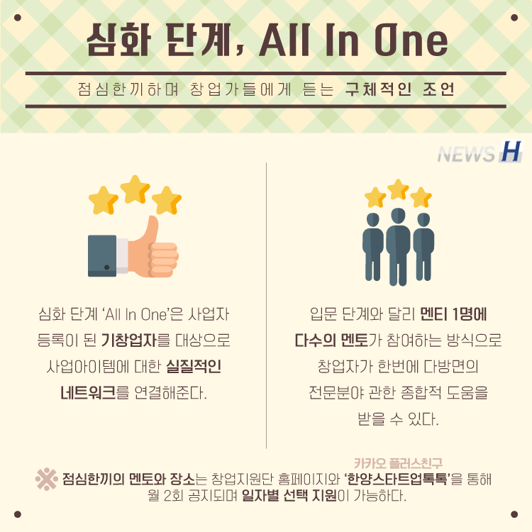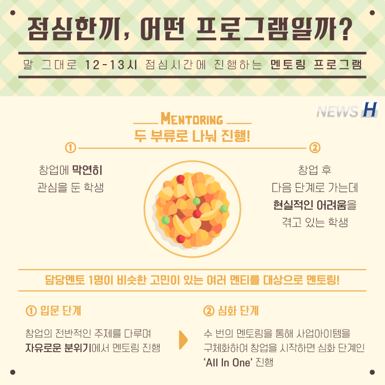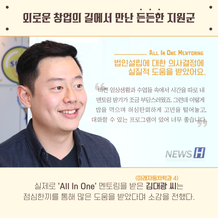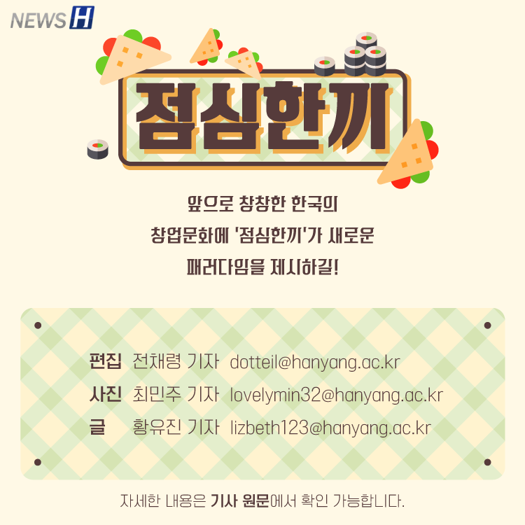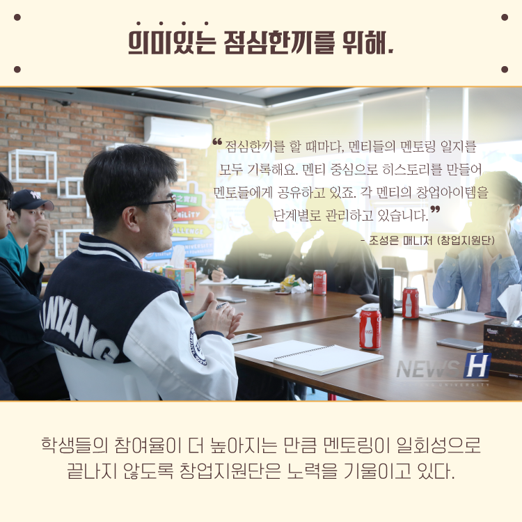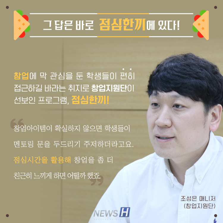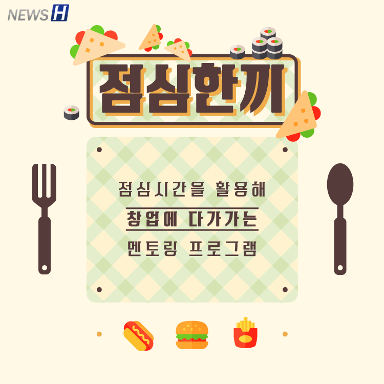 점심시간을 활용해 창업에 다가가는 멘토링 프로그램 ▲ 카드뉴스의 원본 기사는 아래에서 읽을 수 있습니다- 숨은 예비 창업가를 위한 시간 ‘점심한끼’ 전채령 dotteil@naver.com 다른기사 보기 저작권자 © 뉴스H 무단전재 및 재배포 금지 당신만 안 본 뉴스 [포토스토리] "AI 시대 해답은 브랜딩", 오세훈 서울시장의 경영학 특강 현장 Into the Creation 2025, 창작자들의 꿈에 날개를 이찬규 학생, 사이버·우주 융합연구로 2025 사이버안보논문공모전 대상 수상 한양대, '2026 QS 지속가능성 순위' 세계 161위, 국내 4위 기록 해커톤에서 인턴십까지, 현대차 사내 스타트업에 다녀오다 [창업지원단 인턴십 경험기] [포토스토리] 한양 속에 사회혁신을 품다, SSIR 먼슬리 콜로키움 현장 행복은 좋은 경험의 ‘빈도’에서, 서은국 교수와 함께한 한양인의 힐링콘서트 현장 [포토스토리] "AI 시대 해답은 브랜딩", 오세훈 서울시장의 경영학 특강 현장 댓글삭제 삭제한 댓글은 다시 복구할 수 없습니다. 그래도 삭제하시겠습니까? 비밀번호 닫기 기사 댓글 0 댓글 접기 로그인 후 이용 가능합니다. 댓글 내용입력 비회원 로그인 이름 비밀번호 댓글 내용입력 댓글쓰기 계정을 선택하시면 로그인·계정인증을 통해 댓글을 남기실 수 있습니다. 회원 로그인 비회원 글쓰기 이름 비밀번호 자동등록방지 로그인 옵션 창닫기 기획기사 [포토스토리] "AI 시대 해답은 브랜딩", 오세훈 서울시장의 경영학 특강 현장 Into the Creation 2025, 창작자들의 꿈에 날개를 해커톤에서 인턴십까지, 현대차 사내 스타트업에 다녀오다 [창업지원단 인턴십 경험기] [포토스토리] 한양 속에 사회혁신을 품다, SSIR 먼슬리 콜로키움 현장 행복은 좋은 경험의 ‘빈도’에서, 서은국 교수와 함께한 한양인의 힐링콘서트 현장 [카드뉴스] '한양대학교 SDGs? 알고 보니 내 일상 속에 있었다!' 1편