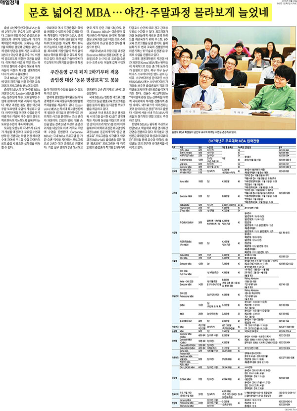 9월 28일 <매일경제>는 한양대 경영전문대학원 특집이 전해졌습니다. 한양대 경영전문대학원은 '실용 학풍을 통해 글로벌 전문인력을 육성하는 아시아·태평양 지역의 선도 대학'이라는 비전을 가지고 2010년 세계경영대학협회 인증을 시작으로 국내 경영전문대학원 중 가장 세분화되고 다양한 과목을 제공하고 있습니다. 한양대 MBA는 원우회 주관으로 한양MBA 학술제와 매달 명사특강 강연을 진행하고 있는데요. 학기별로 '경영전문대학원장과 학생과의 대화의 장' 모임을 통해 교수와 재학생, 졸업생들 간의 끈끈한 유대관계를 이어가고 있습니다. 한양대 MBA 디지털비즈니스 전공에 재학 중인 김진아 씨는 "새로운 시대에 맞게 변화하는 MBA 커리큘럼이 있는지 살펴봤고 시대 변화를 이끄는 선두주자가 한양대 MBA라고 판단했다. 지금은 그 선택에 만족하고 있다"며 "한양대에서 공부하지 않았더라면 디저털 미디어를 기반으로 한 콘텐츠 분야에 대해 지금과 같은 관심이나 전문성을 갖추기는 어려웠을 것"이라고 말했습니다.