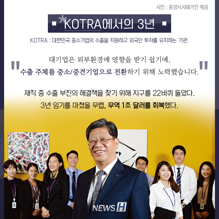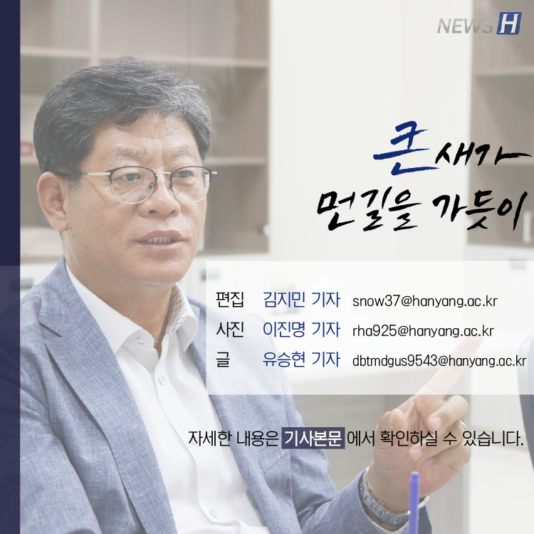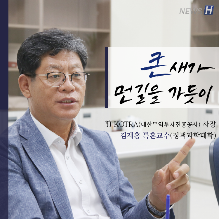 前 KOTRA(대한무역투자진흥공사) 사장 김재홍 특훈교수(정책과학대학) ▲ 카드뉴스의 원본 기사는 아래에서 읽을 수 있습니다큰 새가 먼길을 가듯이▲ Click to read the English articleLook Far, and Take Steady Steps 김지민 spotlight_5@naver.com 다른기사 보기 저작권자 © 뉴스H 무단전재 및 재배포 금지 당신만 안 본 뉴스 [포토스토리] "AI 시대 해답은 브랜딩", 오세훈 서울시장의 경영학 특강 현장 Into the Creation 2025, 창작자들의 꿈에 날개를 이찬규 학생, 사이버·우주 융합연구로 2025 사이버안보논문공모전 대상 수상 한양대, '2026 QS 지속가능성 순위' 세계 161위, 국내 4위 기록 해커톤에서 인턴십까지, 현대차 사내 스타트업에 다녀오다 [창업지원단 인턴십 경험기] [포토스토리] 한양 속에 사회혁신을 품다, SSIR 먼슬리 콜로키움 현장 행복은 좋은 경험의 ‘빈도’에서, 서은국 교수와 함께한 한양인의 힐링콘서트 현장 2025 중앙일보 대학평가 서울 3위, ERICA 13위 댓글삭제 삭제한 댓글은 다시 복구할 수 없습니다. 그래도 삭제하시겠습니까? 비밀번호 닫기 기사 댓글 0 댓글 접기 로그인 후 이용 가능합니다. 댓글 내용입력 비회원 로그인 이름 비밀번호 댓글 내용입력 댓글쓰기 계정을 선택하시면 로그인·계정인증을 통해 댓글을 남기실 수 있습니다. 회원 로그인 비회원 글쓰기 이름 비밀번호 자동등록방지 로그인 옵션 창닫기 기획기사 [포토스토리] "AI 시대 해답은 브랜딩", 오세훈 서울시장의 경영학 특강 현장 Into the Creation 2025, 창작자들의 꿈에 날개를 해커톤에서 인턴십까지, 현대차 사내 스타트업에 다녀오다 [창업지원단 인턴십 경험기] [포토스토리] 한양 속에 사회혁신을 품다, SSIR 먼슬리 콜로키움 현장 행복은 좋은 경험의 ‘빈도’에서, 서은국 교수와 함께한 한양인의 힐링콘서트 현장 [카드뉴스] '한양대학교 SDGs? 알고 보니 내 일상 속에 있었다!' 1편
