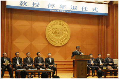 먼저 2시 반에 시작된 교수 정년퇴임식에서는 민득영(의대·기생충학), 지행옥(흉부외과), 함창곡(진단방사선) 교수들을 비롯하여, 이현주(인문대·영어영문), 김필수(자연대·물리), 김문자(음대·작곡), 최은택(체대·경기지도) 등 총 7명의 교수가 정년퇴임식을 가졌다. 특히 해당 대학의 대학장이 맡은 약력 및 공적 소개는 그간의 노고를 증명해 주는 듯 화려한 경력을 다시금 느끼게 해주었다. 정부에서는 이날 퇴임을 한 모든 교수에게 훈장을 수여해 이들의 공적을 기렸다. 이어서 퇴임교수들에게 오랜 시간 변함없이 교육에 이바지한 공로를 기리는 의미에서 학교 차원의 공로패를 수여했다. 이에 퇴임사를 발표한 김필수 교수는 퇴임 교수를 대표해 “지난날의 숱한 애환과 사연이 깃든 캠퍼스에서 정년을 맞이하는 것은 굉장히 의미 있는 일”이라며 “한양의 발전을 기원하며 퇴임 후에도 도움을 주고 싶다”라는 말로 끝나지 않은 모교 사랑을 표현하기도 했다.