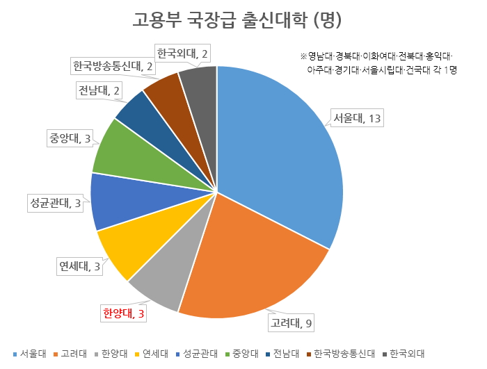 한양대 출신은 총 3명으로, 이명로 대전지방고용노동청장(행정학 85), 송문현 고용보험심사위원장(행정학 83), 윤현덕 산업재해보상보험심사위원장(법학 87)으로 조사됐다.