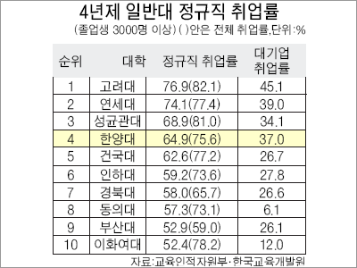 양 캠퍼스의 취업률은 우리나라 4년제 전체대학 평균 취업률 67%보다 10%포인트 가량 높다. 또 정규직 취업률도 전체 평균보다 10%포인트 이상씩 높다. 전체 정규직 취업률은 49.2%이지만 서울캠퍼스 정규직 취업률은 64.9%, 안산캠퍼스 정규직 취업률은 61.8%이기 때문이다. 서울캠퍼스의 정규직 취업률은 전체 졸업생이 3천명 이상인 학교 중에 4위를 차지했다. 수위를 차지한 학교는 고려대 서울캠퍼스로 76.9%이다. 그 뒤를 연세대, 성균관대가 이었다.