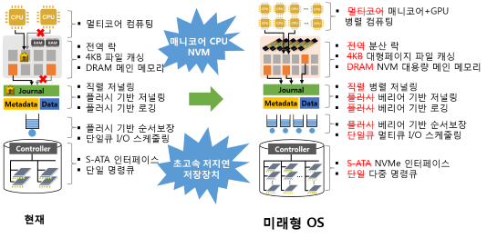 고성능의 저(低)지연 데이터 저장장치가 필요한 시대의 도래. 지금 필요한 것은 방대한 정보자원 관리와 더불어 정보를 안전하게 전송하고 저장 비용을 줄이는 것이다. 인공지능, 빅데이터, 센서데이터와 같은 새로운 응용 소프트웨어들의 등장으로 혁신적인 하드웨어 플랫폼이 요구되고 있다. 하지만 현재 운영체제는 신소프트웨어 변화 속도를 따라잡지 못하고 있다. 이에 원유집 교수(컴퓨터소프트웨어학부)는 초대용량, 비휘발성 메모리를 위한 시스템 개발 추진중에 있다.