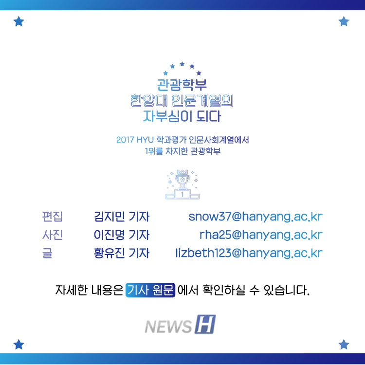 ▲ 카드뉴스의 원본 기사는 아래에서 읽을 수 있습니다관광학부, 한양대 인문계열의 자부심이 되다.▲ Click to read the English articleA Fair Competition For Overall Advancement