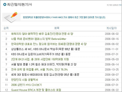 먼저 1위의 영광은 ‘채워지지 않아 매력적인 배우 김효진(인문대·연영 4)’양의 인터뷰 기사가 차지했다. 이 기사는 지난해 6월 둘째 주 작성된 이후 2007년 1월2일 현재까지 15472번의 클릭 수를 기록했다. 뒤이어 2위를 차지한 기사는 ‘너를 위해 준비했어! 캠퍼스의 방학 Before&After’. 여름방학이 끝난 직후 개강을 맞아 달라진 학교의 새로운 모습들을 소개한 커버스토리로 총 클릭 수는 13757번을 기록했다.클릭 수를 기준으로 순위를 매긴 20개의 기사를 살펴보면, 앞서 말한 1위를 포함해 모두 7개 기사가 인터뷰다. ‘한국 대학생 대표로 칸느 광고제에 참석하는 최혜윤(경영대·경영 4) 양’의 인터뷰 기사가 3위를 차지한 데 이어, 본교 동문인 백승주 아나운서와 김윤지 아나운서가 각각 4위와 5위로 그 뒤를 따랐다. 이 기사들은 지금도 꾸준히 그 클릭 수가 늘어나며 가끔 순위 변동도 일어나고 있다. 특히 백승주 아나운서의 기사는 지난 11월 첫 주 작성된 것으로, 홈페이지에 개제된 지 2달밖에 지나지 않았다는 점에서 더욱 시선을 끈다. 현재 이 기사의 현재 클릭 수는 11113번이다. 또한 ‘한국 대학생 대표로 칸느 광고제에 참석하는 최혜윤(경영대·경영 4) 양’은 소위 말하는 유명인이 아닌 재학생이라는 점에서 한양인들의 재학생에 대한 큰 관심을 알 수 있는 대목이었다.