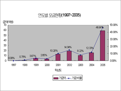 본교 대외협력부총장실에서는 2013년까지 1조원 규모의 재정과 15% 정도의 기부금수입을 거둬 세계 100위권 대학 수준에 맞출 계획을 세워 놓고 있다. 그 가시적 성과로 지난해 열린 ‘2006 한양인의 밤’ 행사에서도 동문들과 교내구성원들의 기부금 행렬이 이어지면서 20억 원이 넘는 발전기금을 모았다. 대외협력부총장 김수삼(공학대·건설환경시스템) 교수는 “본격적인 기부모금활동을 통해 지난해까지 120억 원의 기부금을 만들었다”며 “2010년까지 누적기부금 1천억 원을 모아 세계 100위권 대학으로의 성장에 필요한 밑거름을 만들어 갈 것이다”고 밝혔다.
