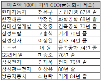 한편 161명의 CEO를 대상으로 한 이번 조사에서 주목할만한 점은 본교 출신의 CEO는 모두 이공계 출신이라는 점이다. 다른 기업 역시 이공계 출신의 CEO 비율이 높아 기술이 기업의 경쟁력을 좌우하는 시기가 도래했음을 보여준다. 실제로 이공계 비율은 1994년 28%에서 2000년 36%, 지난해 40% 등으로 증가해 왔으며, 이러한 결과는 이공계 CEO들의 기술력에 대한 우수한 식견과 전문성이 기업 발전의 중요한 밑바탕이 됨을 보여준다. 이와 같은 현상은 전통적으로 우수한 이공계 출신 동문이 많은 본교에 유리한 환경이 조성되고 있음을 뜻하는 대목이기도 하다.실제로 본교 이공계 출신의 현대자동차 회장 정몽구(공업경영 67년 졸) 동문, LG전자 부회장 김쌍수(기계 69년 졸) 동문, 삼성전자 LCD 총괄 사장 이상완(전자 74년 졸) 동문, 삼성토탈 사장 고홍식(기계 70년 졸) 동문, 쌍용자동차 사장 최형탁(기계 84 졸)동문, 포스코 사장 이 윤(금속공학 74 졸) 동문 등 굵직굵직한 CEO들이 주요 기업체에서 활동하고 있다.