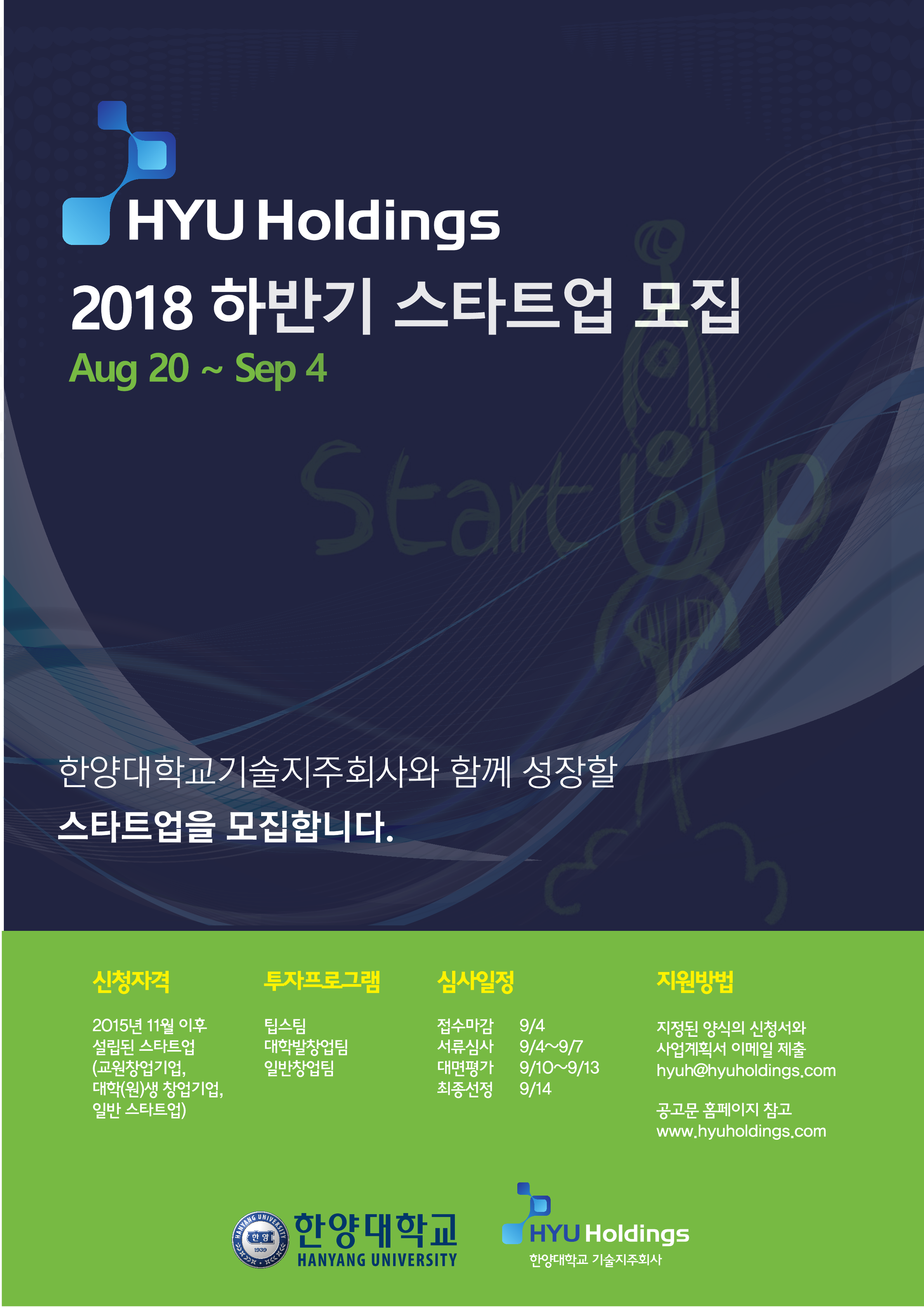 지원을 희망하는 기업은 한양대 기술지회사 홈페이지(www.hyuholdings.com)에서 지정된 양식의 신청서 및 사업계획서를 다운로드 받아 작성해 이메일(hyuh@hyuholding.com)로 접수하면 된다.