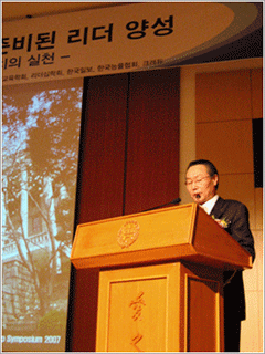 지난 12일, 한양리더십센터 주최로 ‘한양 리더십 개발 심포지엄 2007(이하 심포지엄)’을 개최했다. HIT에서 열린 이날 심포지엄은 국내 최초의 리더십 인증제인 ‘한양 리더십 프로그램(HELP)’을 활성화와 산학 협동 강화를 위해 마련됐다. 심포지엄에는 김종량 총장과 리더십센터장 송영수(사범대·교육공학) 교수 등 교내 인사를 비롯해 국내외 대기업 임원, 금융기관 관계자, 학생 등 총 400여명이 참석해 성황을 이뤘다.행사는 김 총장의 축사에 이어 HELP 프로그램 개발에 기여한 (주)크레듀 김영순 대표이사에게 감사패를 전달하는 순서로 진행됐다. 김 총장은 축사에서 “4차 세계대전이 일어난다면 그것은 인재 전쟁이 될 것”이라며 “하지만 기업에서는 여전히 인재가 없다고 말한다. 기업이 필요한 인재를 양성하는 것은 매우 중요한 과제다”라고 말했다. 한양리더십센터장 송 교수 역시 “3년 뒤의 경쟁력을 예측할 수 없는 상황에서 가장 확실한 전략은 우수 인재를 확보하는 것”이며 “이 같은 인재들은 하루아침에 만들어 지지 않기 때문에 꾸준히 차세대 핵심리더를 양성하는 게 중요하다”고 말했다.