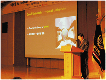 특강에 이어 듀폰 김정원 부사장, LG그룹 인화원 김경수 상무, SK그룹 김홍묵 상무, 유영만(사범대·교육공학) 교수가 ‘기업이 요구하는 인재상 및 핵심가치와 젊은 리더의 자세’에 대해 토론을 벌였다. 기업과 사회가 요구하는 인재는 본교의 실용학풍과도 일맥상통하는 실사구시(實事求是) 형으로 압축된다. 세계적인 종합과학회사 듀폰의 김정원 부사장은 “창의는 기발성과 유효성의 결합이며 열정은 자기 자신에게서 솟는 에너지다”라고 말했다. 이어 “듀폰코리아는 외국계 회사인 만큼 우리와 다른 문화를 존중하는 태도가 필요하다. 개인을 존중하고 법을 준수하는 사람이 바로 우리가 원하는 인재상”이라고 밝혔다.