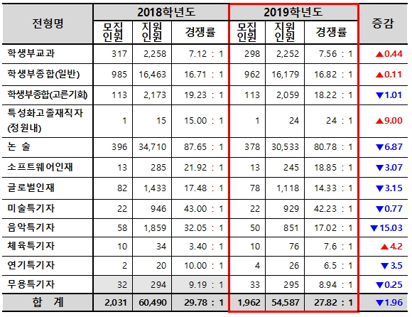 글로벌인재전형은 14.33대 1로 전년보다 3.15포인트 하락했다. 특성화고졸재직자전형은 지난해보다 9포인트 상승한 24대 1을 기록했고, 학생부교과전형도 7.56대 1로 작년보다 0.44포인트 높게 나타났다.