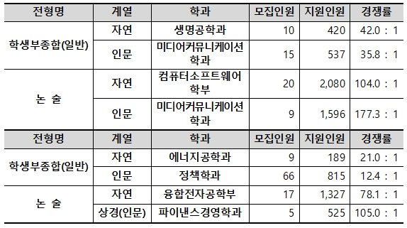 학생부종합(일반) 전형 최고 경쟁률은 생명공학과(경쟁률 42대 1)와 미디어커뮤니케이션학과(35.8대 1)로 나타났다. 논술전형에는 컴퓨터소프트웨어학부(104대 1)와 미디어커뮤니케이션학과(177.3대 1)가 최고경쟁률을 기록했다.