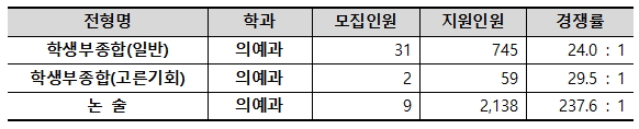 의예과 경쟁률을 살펴보면, ▲학생부종합(일반) 24대 1 ▲학생부종합(고른기회) 29.5대 1 ▲논술 237.6대 1로 나타났다.