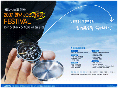 한편 취업센터는 『2007 한양 JOB 컨설팅 페스티벌』을 개최한다. 우선 9일과 10일에는 서울캠퍼스 HIT 5층에서 취업컨설팅, 면접컨설팅, 진로컨설팅을 실시한다. 전문컨설턴트들이 이력서, 자격증, 영어면접, 영어 인터뷰 등을 1:1로 진단해 준다. 특히 공무원 및 공사와 스튜어디스, 해외 인턴십 컨설팅도 예정돼 있다. 또한 삼성 등 10여 개 기업의 채용관이 설치되며 취업 Book Cafe 등도 운영된다.