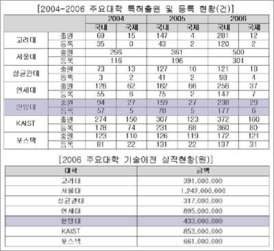 본교는 국내 대학의 특허 중시 분위기를 리드해온 입장이라 할 수 있다. 지난해 발표됐던 2005년 특허 실적에서 본교는 특허 출원 및 등록이 전국 대학 중 4위였다. 올해 발표된 2006년 현황에 서는(표 참조) 본교가 국내 특허 출원 2백 38건, 특허 등록 1백 77건으로 3위를 차지했다. 5백 건을 출원하고 3백 1건을 등록시킨 서울대와, 3백 72건을 출원하고 3백 60건을 등록시킨 한국과학기술원이 1위와 2위였다. 본교는 특허 ‘출원’ 건수에서는 연세대와 고려대에 뒤처지는 모습을 보였으나 특허 ‘등록’ 건수에서는 앞서는 내실 있는 모습을 보였다. 본교의 특허 수치는 매년 큰 폭의 상승률을 기록했던 것으로 지난해까지 본교의 3년간 총 특허 출원 수는 4백 91건에 달한다.본교는 등록한 특허에서 얻는 기술료 수입에서도 상당히 앞선 모습을 보여 왔다. 2004년 9억8천8백만 원, 2005년 2억 8천만 원의 수익을 기반으로 2005년까지 3년간 총 12억 5천만 원의 기술료 수익을 거둔 것이다. 지난해에는 4억 3천여만 원의 수익을 올려 국내 대학에서 5위의 기술료 수입 실적을 거둔 것으로 나타났다(표 참조). 올해는 약 7억여 원의 기술료 수입을 계획하고 있다.