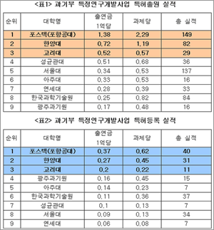 본교는 특허 출원과 특허 등록에 있어 연구비당 생산성에서 앞서는 모습을 보이기도 했다. 지난해 발표된 ‘과기부 특정연구개발사업 특허 출원 실적’에서 본교는 출연금 1억 원 당 0.72건의 실적을 보여 2위를 차지했고 ‘특허 등록 실적’에서도 출연금 1억 원 당 0.27건의 실적을 보여 2위를 차지했다.