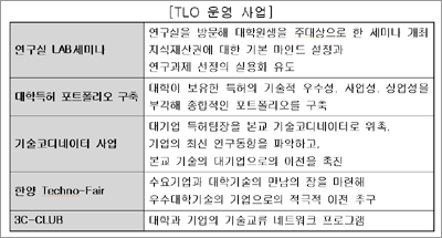 우리 정부는 지난해 총 28개 대학 및 연구소를 기술이전전담조직(TLO) 사업단으로 선정할 때 본교와 서울대, 고려대, KAIST 등을 최우수산업단으로 선정했다. 이에 본교는 향후 5년간 교육부와 산업자원부로부터 매년 3억 9천만 원의 예산을 지원받게 됐다. 또한 본교는 산학협력단 내에 이를 설치하며 IT, NT, BT 분야의 변리사를 3명 충원했다. 기술이전전담조직(TLO)은 연구가 벌어지고 있는 Lab에 방문해 연구 과제가 처음부터 실용적인 것으로 선정될 수 있도록 교육하거나, 우리 대학이 보유하고 있는 특허가 기술적 우수성, 사업성, 상업성의 측면에서 부각될 수 있도록 종합 포트폴리오를 만들어내는 작업 등을 하고 있다. 또한 대기업의 특허팀장을 본교 ‘기술코디네이터’로 위촉해 대기업의 최신 연구동향을 파악하고 있으며 대기업으로의 본교 기술 이전을 위해서도 노력하고 있다. 수요 기업과 대학 기술 간의 만남의 장이 되는 한양 Techno-Fair와 현재 약 64개의 기업이 회원으로 참여하고 있는 3-C Club프로그램도 기술이전전담조직(TLO)이 펼치는 중요한 활동들이다.21세기, 특허가 대세다