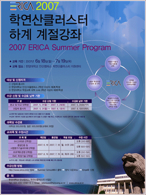 산학협력 중심대학으로 선정된 이후 본교 안산캠퍼스는 연구, 인턴쉽 등 다양한 분야에서의 학·연·산 협력이 진행되어 왔다. 하지만 강의 내 학·연·산이 함께 하는 기회는 이번이 처음. 6월 18일부터 5주간 진행되는 이번 ‘2007 ERICA Summer Program'은 수강료를 일부 재환급 해주는 노동부 환급과정을 통한 강의 진행으로 안산시 내 산업체 근로자를 전체 수강 정원의 50%로 예상하며, 다양한 분야의 기업 내 실무담당자들이 수업에 함께할 계획을 갖고 있다. 또한 학기 중에 이뤄지는 정규 학연산 강의에 대한 타 학교 학생들의 문의가 이어지면서 고려대학교, 경희대학교(수원), 아주대학교, 경인교육대학교 등 본교와 학점 교류가 가능한 37개 대학의 학생들에게도 학연산 클러스터 교육 이수의 기회가 주어졌다. 총 30시간에 걸쳐 이뤄질 본 Summer School은 학점 이수 뿐 아니라 수업에 참여하는 학생들에게 간접 기업체험이라는 좋은 경험이 될 것으로 기대되고 있다. 본 프로그램을 주관하는 학연산 클러스터 측은 “정규 학연산 클러스터 교육의 성과를 지역사회로 확산하고자 준비한 프로그램”이라며, “다양한 경험 교류의 장이 될 것”이라 전망했다. 특히 올해 처음 시작하는 본 Summer School은 학점 교류 대학의 학사과와 산학협력단을 통한 홍보와 유명 포털사이트 내 키워드 등록, 안산시 내 2000여 개 기업으로의 리플릿 발송 및 산업단지 공단 등을 통한 프로그램 소개 등 활발한 홍보를 통해 타 대학의 참여와 외부 기업체의 많은 참여를 이끌어 낼 전망이다.