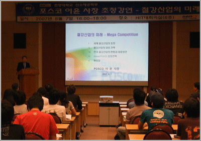 “오랜 시간이 지나서 학교에 다시 오니 감회가 새롭다”는 말로 강연을 시작한 이 사장은 철강 산업의 동향을 소개하며 “현재 한국의 철강 산업이 튼튼해 보이는 겉보기와는 달리 커다란 위기에 빠져 있는 상황이다”는 언급을 했다. 그 위기의 실체는 내수 시장의 포화와 그가 ‘Mega-competition’이라 명명한 세계 철강 기업들과의 경쟁이다. 그가 강연을 위해 준비한 동영상 자료에는 적대적 인수합병을 통해 철강 분야에서 1위 기업의 전 세계를 무대로 한 독점화가 빠르게 진행되고 있으며 그 손길이 곧 아시아에도 미칠 것을 경고하는 내용이 담겨 있었다.이 사장은 “만일 경쟁에서 낙오된다면 대기업이라도 금방 무너질 것”이라며 위기의 대응책으로 규모의 성장과 원가혁신, 제조업의 체질개선을 바탕으로 경쟁력을 갖추는 것이 급선무라 강조했다. 또한 그는 “내수시장이 포화 상태에 이른 위기는 해외 생산기지 건설과 더불어 새로운 기술의 개발을 통해 극복해야 한다”고 해결책을 제시했다. 그래서 포스코는 기술혁신에 매달렸고 그 성과로 최근, 2조1천억원을 들여 세계 최초로 개발한 독자적 기술인 파이넥스(Finex) 공법을 도입한 공장을 설립해 세계의 주목을 받기도 했다.