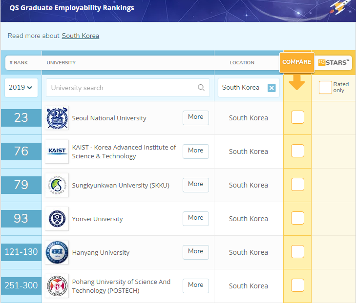 국내 대학 중 가장 높은 순위는 서울대(23위)로 나타났다. 이어 ▲카이스트(76위) ▲성균관대(79위) ▲연세대(93위) ▲한양대(121-130위) ▲포스텍(251-300위) 등 국내 대학 12곳이 순위 안에 들은 것으로 알려졌다.