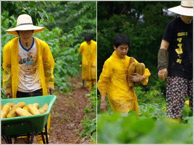 자가용 없이 대중교통만으로 농촌학생연대활동(이하 농활) 현장을 찾기란 쉽지 않았다. 용산에서 평택까지 기차로 이동한 후, 다시 시내버스를 타고 안중을 찾았다. 안중터미널에서 수원행 버스로 갈아타고 청북면에서 내려 농활단이 머무는 고잔 3리 까지는 도보로 이동했다. 한 시간에 한 대씩 다닌다는 마을버스를 기다릴 자신이 없었기 때문이다. 잠시 소강상태를 보이던 하늘은 기자가 차에서 내리자마자, 마치 약속이라도 한 듯 보슬보슬 비를 뿌리기 시작했다. ‘일하는 모습을 취재해야할 텐데…’ 걱정이 앞선다. 약속한 장소에 도착하자 마을주민이 트럭을 타고 마중을 나왔다. 트럭 뒤에는 이제 막 수확을 시작한 노각(늙은 오이)이 한 아름 담겨 있었다.
