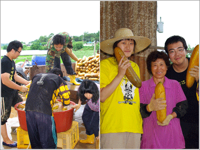 고잔 3리 농민들과 농활단은 노각을 수확하느라 분주했다. 6월 하순부터 8월 중순 무렵까지 수확되는 노각은 대표적인 평택의 특산물이다. 수확되면 곧장 서울 가락동 농수산물 시장으로 출하된다. 노란 우비를 입은 학우들이 수레를 연신 움직이며 노각을 날랐다. 얼마 지나지 않아 1톤 트럭에 노각이 가득 찼다. 고잔리 곳곳에서 활약하는 농활단이 있음에도 불구하고, 여전히 일손이 달린다. 따라서 자연히 주민들의 반응도 좋다. 농민 신평호(남·51) 씨는 “남의 귀한 자식들이 농촌까지 내려와서 참 고생을 많이 하고 있다. 나도 대학생 딸이 있지만 자식 같은 학생들이 그저 고마울 따름”이라 말했다. 이어 “주민에게 피해 주지 않겠다고 마을회관에서 손수 밥해먹는 모습을 보면 마음가짐이 어른스럽다”며 대견스러워 했다.다른 가구를 찾았다. 노란셔츠와 밀짚모자, 예비군복이 잘 어울리는 다른 무리의 학우들이 트럭에서 노각을 내리며 씻고, 분류하는 작업을 했다. 한편에서는 박소연 (언정대·신문방송정보사회 1) 양이 노각을 포장할 박스를 조립하고 있었다. 주변 학우들은 그녀가 “박스 조립에 도가 트인 것 같다”며 자랑스러워했다. 박 양은 “자주하다보니 박스를 빨리 접을 수 있게 돼 분업 차원에서 박스만 접게 됐다”면서 “여름농활은 봄에 비해 일감이 적어 수월한 편이다. 일주일 남짓 다녀가는 거라 힘들다는 생각은 하지 않는다”고 소감을 밝혔다. 이 같은 학생들의 열정에 농민들은 고마움을 나타냈다. 노각 농사를 짓는 김 씨 할머니(여·61)는 “이젠 학생들이 단골손님이 된지 오래라 해마다 기다려진다. 일손이 달려 아들 녀석이 와서 도와줘도 바쁜데 학생들까지 와서 거들어 한결 편하다”며 뿌듯해했다. 이어 김 할머니는 A급 노각을 들고선 “잘생긴 이 노각처럼 학생들도 멋있게 늙어가지 않겠냐”며 활짝 웃었다.
