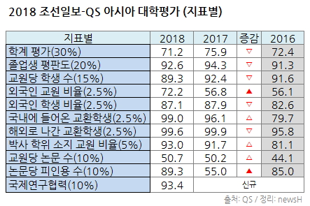 조선일보는 영국 글로벌 대학 평가 기관인 QS(Quacquarelli Symonds)와 공동으로 아시아 17개국, 503개 대학을 평가하고 10월 23일 평가결과를 발표했다. 올해부터는 해당 대학 교수가 다른 나라 연구자와 얼마나 공동 연구를 많이 하는지를 평가하는 지표인 '국제 연구 협력(IRN)' 지표 라는 새로운 지표가 도입돼 총 11개 평가 지표가 사용됐다. 평가 지표는 ▲학계 평가(30%) ▲졸업생 평판도(20%) ▲논문당 피인용 수(10%) ▲박사 학위 소지 교원 비율(5%) ▲외국인 교원 비율(2.5%) ▲외국인 학생 비율(2.5%) ▲해외로 나간 교환학생(2.5%) ▲국내에 들어온 교환학생(2.5%) ▲교원당 학생 수(15%) ▲교원당 논문 수(10%) ▲국제연구협력(IRN) 10% 등이다.