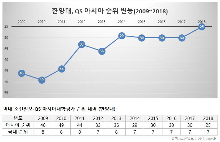 한양대가 '2018 조선일보·QS 아시아 대학 평가'에서 지난해보다 5단계 오른 아시아 25위를 차지했다. 아시아 30위 이내에 든 국내 종합대학은 서울대(10위), 고려대(12위), 성균관대(15위), 연세대(17위), 한양대(25위)로 한양대는 국내 종합대학 중에서 5위를 기록했다.