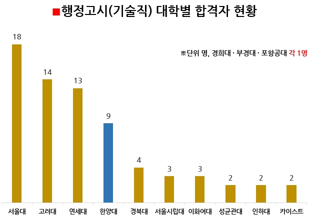 법률저널은 9월 29일 발표된 2018년도 5급 공채 기술직 최종합격자 73명(전국모집 66명, 지역모집 7명)의 출신대학을 파악한 결과, 서울대가 18명( 24.7%)으로 가장 많다고 전했다. 이어 고려대 14명(19.2%), 연세대 13명(17.8%), 한양대 9명(12.3%), 경북대 4명(5.5%), 서울시립대·이화여대 각 3명(각 4.1%), 성균관대·인하대·카이스트 각 2명(각 2.7%), 경희대·부경대·포항공대 각 1명(각 1.4%) 등의 순이었다.
