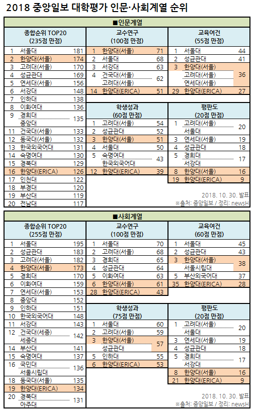 인문계열 평가 1위는 종합 점수 195점을 받은 서울대가 차지했다. 이어 성균관대(183점), 고려대(182점), 한양대 서울캠퍼스(173점), 경희대(170점) 등이 톱5에 이름을 올렸다. ERICA캠퍼스는 인문계열 평가에서 종합 점수 126점으로 16위를 기록했다.