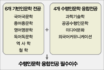 수행 융합전공 교육은 학생들이 기반인문학 6개 전공(국어국문학, 중어중문학, 영어영문학, 독어독문학, 역사학, 철학) 중 1개 전공과 학제간 내용을 기초한 수행인문학 4개 융합전공 프로그램(과학기술학, 공공수행인문학, 미디어 문화, 외국어커뮤니케이션) 중 1개 전공을 조합·이수하는 체계이다. 예를 들어, 한 학생이 기반 인문학으로 국어국문학을 전공(36학점 이상)하고 수행인문학 융합전공으로 미디어문화를 이수(36학점 이상)하면 졸업 시 전공에는 국어국문학, 융합전공에는 미디어문화, 이렇게 두 개의 학사 전공 과정이 표기된다. 또 다른 학생의 경우, 기반 인문학으로 영어영문학을 전공(36학점 이상), 수행인문학으로 외국어커뮤니케이션 전공(36학점 이상)을 4학년 1학기까지 이수한다면 4학년 2학기부터 학·석사 통합과정으로 음성과학 석사과정을 진행할 수 있는 것이다.