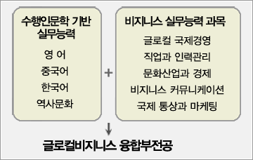 글로컬비즈니스 융합부전공 교육이란 나열식 교양 교육을 지양하고 고급 비즈니스 실무 능력을 교육할 수 있도록 체계화된 교양교육이다. 자세히 말해 수행인문학 기반 실무 능력 과정(영어, 중국어, 한국어, 역사문화)을 공통경영 핵심과목과 함께 소정 기준 이상으로 이수했을 때, 학사 학위증에 융합부전공을 병기해 수여하는 교육과정이다. 여기서 소정 기준 이상이라 함은 영어비즈니스 융합부전공의 경우 TOEIC 800점 이상 성적, 중국어비즈니스 융합부전공의 경우 한어수평고시(HSK) 6급 이상 성적 등으로 구체적인 언어 실무능력이 평가된다.이와 같은 수행인문학 융합전공, 글로컬비즈니스 융합부전공은 본교가 닦아온 연구·교육 기반, 인문학적 역량과 융합해 큰 효과를 낼 것으로 기대된다.
