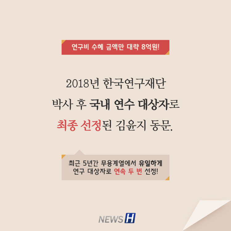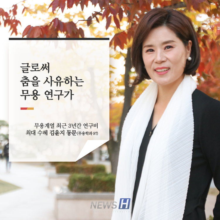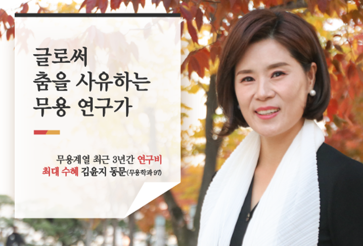 무용계열 최근 3년간 연구비 최대 수혜 김윤지 동문(무용학과 97) ▲ 카드뉴스의 원본 기사는 아래에서 읽을 수 있습니다- 글로써 춤을 사유하는 무용연구가▲ Click to read the English article- Carrying Out “Love in Deed” as a Researcher in Korean Dance 관련기사 김윤지 동문, 교육부 학술·연구지원사업 우수성과 선정 전채령 dotteil@naver.com 다른기사 보기 저작권자 © 뉴스H 무단전재 및 재배포 금지 당신만 안 본 뉴스 [포토스토리] "AI 시대 해답은 브랜딩", 오세훈 서울시장의 경영학 특강 현장 Into the Creation 2025, 창작자들의 꿈에 날개를 이찬규 학생, 사이버·우주 융합연구로 2025 사이버안보논문공모전 대상 수상 한양대, '2026 QS 지속가능성 순위' 세계 161위, 국내 4위 기록 해커톤에서 인턴십까지, 현대차 사내 스타트업에 다녀오다 [창업지원단 인턴십 경험기] [포토스토리] 한양 속에 사회혁신을 품다, SSIR 먼슬리 콜로키움 현장 행복은 좋은 경험의 ‘빈도’에서, 서은국 교수와 함께한 한양인의 힐링콘서트 현장 2025 중앙일보 대학평가 서울 3위, ERICA 13위 댓글삭제 삭제한 댓글은 다시 복구할 수 없습니다. 그래도 삭제하시겠습니까? 비밀번호 닫기 기사 댓글 2 댓글 접기 로그인 후 이용 가능합니다. 댓글 내용입력 비회원 로그인 이름 비밀번호 댓글 내용입력 댓글쓰기 계정을 선택하시면 로그인·계정인증을 통해 댓글을 남기실 수 있습니다. 회원 로그인 비회원 글쓰기 이름 비밀번호 자동등록방지 로그인 옵션 창닫기 댓글목록 최신순 추천순 욕설, 타인비방 등의 게시물은 예고 없이 삭제 될 수 있습니다. 성지윤 2018-11-22 13:14:01 더보기 삭제하기 역시 김윤지 교수님 멋져용 ! 장준혁 2018-11-22 13:11:49 더보기 삭제하기 너무 멋있습니다,, 존경합니다 교수님!! 기획기사 [포토스토리] "AI 시대 해답은 브랜딩", 오세훈 서울시장의 경영학 특강 현장 Into the Creation 2025, 창작자들의 꿈에 날개를 해커톤에서 인턴십까지, 현대차 사내 스타트업에 다녀오다 [창업지원단 인턴십 경험기] [포토스토리] 한양 속에 사회혁신을 품다, SSIR 먼슬리 콜로키움 현장 행복은 좋은 경험의 ‘빈도’에서, 서은국 교수와 함께한 한양인의 힐링콘서트 현장 [카드뉴스] '한양대학교 SDGs? 알고 보니 내 일상 속에 있었다!' 1편