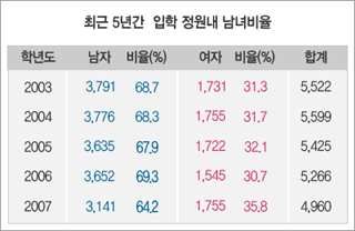 전통적으로 본교는 ‘공대이미지'가 강했다. 때문에 여학생의 공학계열 진학이 상대적으로 적었다. 그렇기에 그동안 남학생이 많은 학교로 알려져 온 것이 사실. 하지만 계속 여학생들의 수가 늘어나고 있다. 서울캠퍼스의 경우 지난 90년 18.7%, 95년 22%이던 여학생 비율이 2007년 현재 35.8%까지 올랐다. 안산캠퍼스도 여학생 수가 꾸준히 늘어 지난 92년 20.9%에서 올해 36.8%로 10년 사이에 약 2배가 증가했다. 최근 5년간 입학 정원 내 남녀 비율은 남학생은 68.7%에서 64.2%로 줄어들고 있는 반면, 20%대에 머물던 여학생 비율은 35.8%로 증가 추세다.이러한 추세에 대해 서울캠퍼스 입학홍보계장 안종길 과장은 “남학생 중심의 이미지가 강한 본교에 여학생이 증가하는 것은 바람직한 현상이라고 본다”며 환영했다. 이어 안 과장은 “여성의 사회 진출이 더욱 강화되는 추세 속에서 여학생에게 관심을 갖지 않으면 일류 대학이 될 수 없다”고 밝혔다. 졸업을 앞둔 4학년 학생들도 캠퍼스에서 심심치 않게 보이는 여학생들의 활보가 놀랍다고 말한다. 박은정(공학대·건축 5) 양은 “1, 2학년 수업 시간에 함께 공부했던 여학생들은 나를 비롯해 몇 명에 불과했다. 휴학기간까지 포함해 4년이 흐른 지금, 강의실에서 많은 여학생들을 볼 수 있어 전공수업에 활기가 넘치는 것 같다”고 말했다.