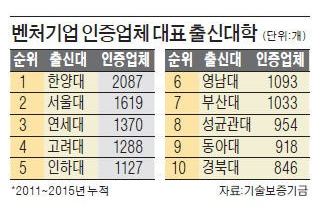 26일 한국경제는 기술보증기금이 5년간(2011~2015년) 인증해 준 벤처기업의 CEO 출신대학을 분석한 결과를 공개했다. 벤처기업 인증 제도는 기술보증기금이 벤처 기업 중 기술 및 경영혁신에 관한 능력이 우수한 중소기업 중 벤처확인 유형별 요건을 갖춘 기업에 부여하는 인증으로 각종 세제와 금융 혜택 등을 우대받을 수 있도록 한 우수기업 육성 제도다.