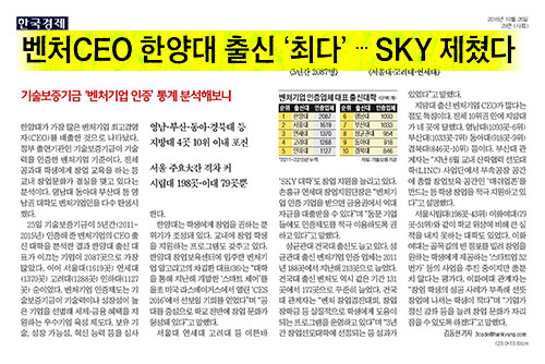 국내 대학 중 가장 많은 벤처기업 최고경영자(CEO)를 배출한 대학은 한양대로 확인됐다. 5년간 누적 인원은 2,087명으로 2위인 서울대의 1,619명을 크게 앞섰다.