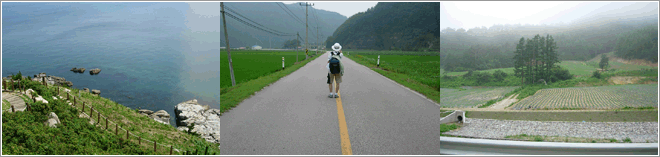 첫날부터 폭우가 쏟아져 출발이 조금 불안했다. 짐은 다 젖어버리고, 앞으로 이렇게 부산까지 갈일을 생각하니 다짜고짜 떠나온 것이 벌써부터 후회되기 시작했다. 하지만 그것은 우리에게 마지막으로 내린 비였다. 다음날부터 우리를 기다린 것은 연일 35도를 웃도는 폭염. 찌는 더위 속에 우리는 강원도에서 부산까지 이어진 7번 국도를 기본으로 잡고 걸었고, 중간에 가보고 싶은 곳이 있으면 다른 길로 빠지기도 했다. 걷고 또 걷다 지치면 길가 의자에 누워 자기도 하고 지나가는 차를 얻어 타기도 했다. 밥은 눈치껏 하루에 보통 한 두 끼는 얻어먹을 수 있었고, 낮에 배가 고프면 물에 미숫가루를 타서 마셨다.텐트는커녕 이불 한 장도 가져가지 않은 우리는 날마다 잠잘 곳도 구해야 했는데, 저녁이 되면 시골 마을로 들어가 마을회관이나 교회들을 찾아다녔다. 수월한 날엔 한 번에 잘 곳을 구할 수 있었지만, 운이 없는 날은 두세 시간씩 온 동네를 헤집어도 구할 수 없는 날도 있었다. 하루는 마을 두 곳에서 퇴짜를 맞고 큰 읍까지 나갔다가 결국 읍사무소 소파에서 잠을 자기도 했었다. 그땐 참 피곤하고 힘들다고 느꼈지만 지금 생각하면 모두 소중한 추억이다. 걷는 중에 등산과 해수욕도 하고 동굴이나 박물관도 찾아다니면서 많은 것을 봤다. 여행하는 내내 우리나라에도 외국 못지않은 절경들이 많다는 것을 새삼 느꼈다. 강원도의 굽이진 산자락과 물 속까지 환히 비추는 영덕의 푸른바다는 지금까지도 잊을 수가 없다.