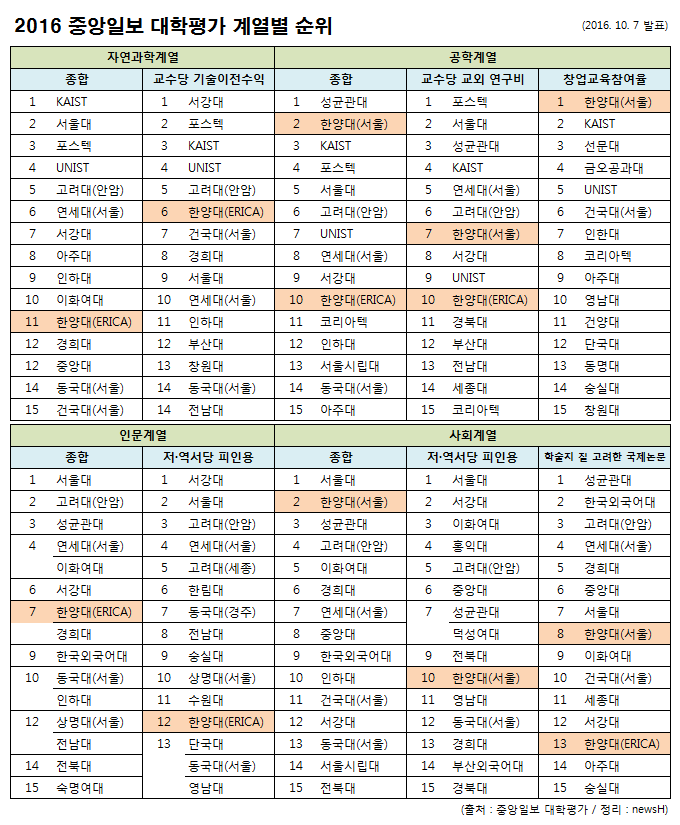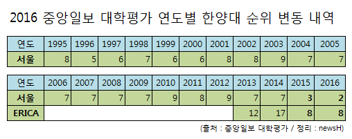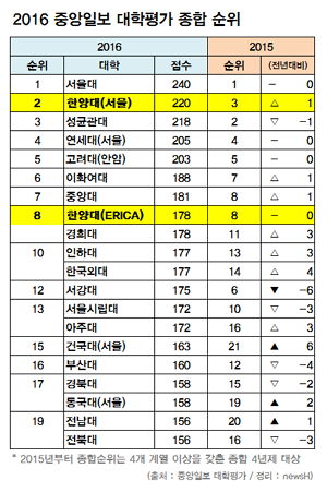 17일 중앙일보가 '2016 대학평가' 결과를 발표됐다. 한양대 서울캠퍼스는 역대 최고 순위인 종합 2위에 올라섰으며, ERICA캠퍼스는 전년과 동일한 8위 자리를 지켰다. 역대 최고 성적이다.