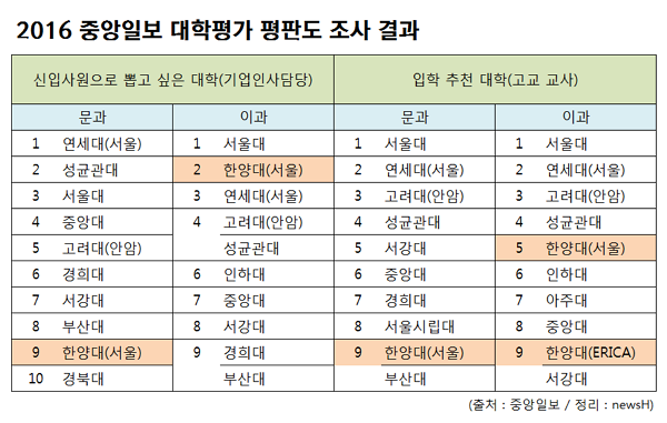 세부 평가 내역 중 평판도 순위를 보면, 기업 인사담당자에게 물은 ‘신입사원으로 뽑고 싶은 대학’명단에 한양대는 문과에서 9위, 이과에서는 서울대 다음인 2위에 이름을 올렸다. 고교 교사가 답한 ‘입학 추천 대학’의 경우 문과는 서울캠퍼스만 9위였지만 이과의 경우 서울캠퍼스가 5위, ERICA캠퍼스가 9위를 기록했다.