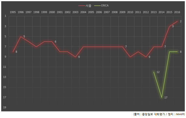 2013년도 첫 분리평가로 12위라는 놀라운 순위로 평가에 단독 참여하게 된 ERICA캠퍼스는 2014년에 17위를 기록하기도 했지만 2015, 2016 연달아 8위를 기록하면서, 흔들림 없는 모습을 보였다. 추세로 봤을때는 어느 정도 위치를 다진 것으로 보인다.