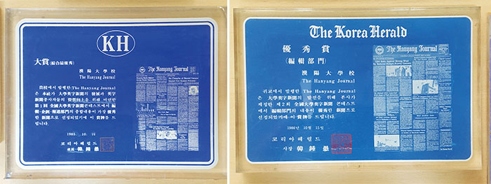 <The Korea Herald>가 1985년 대학영자신문 콘테스트를 했는데 <The Hanyang Journal>이 대상을 받았다. 이듬해에도 최우수 편 집상과 우수 기사상을 받았다. 상패를 들고 총장께 보고하러 갔다가 격려금을 받은 기억이 새록새록하다.
